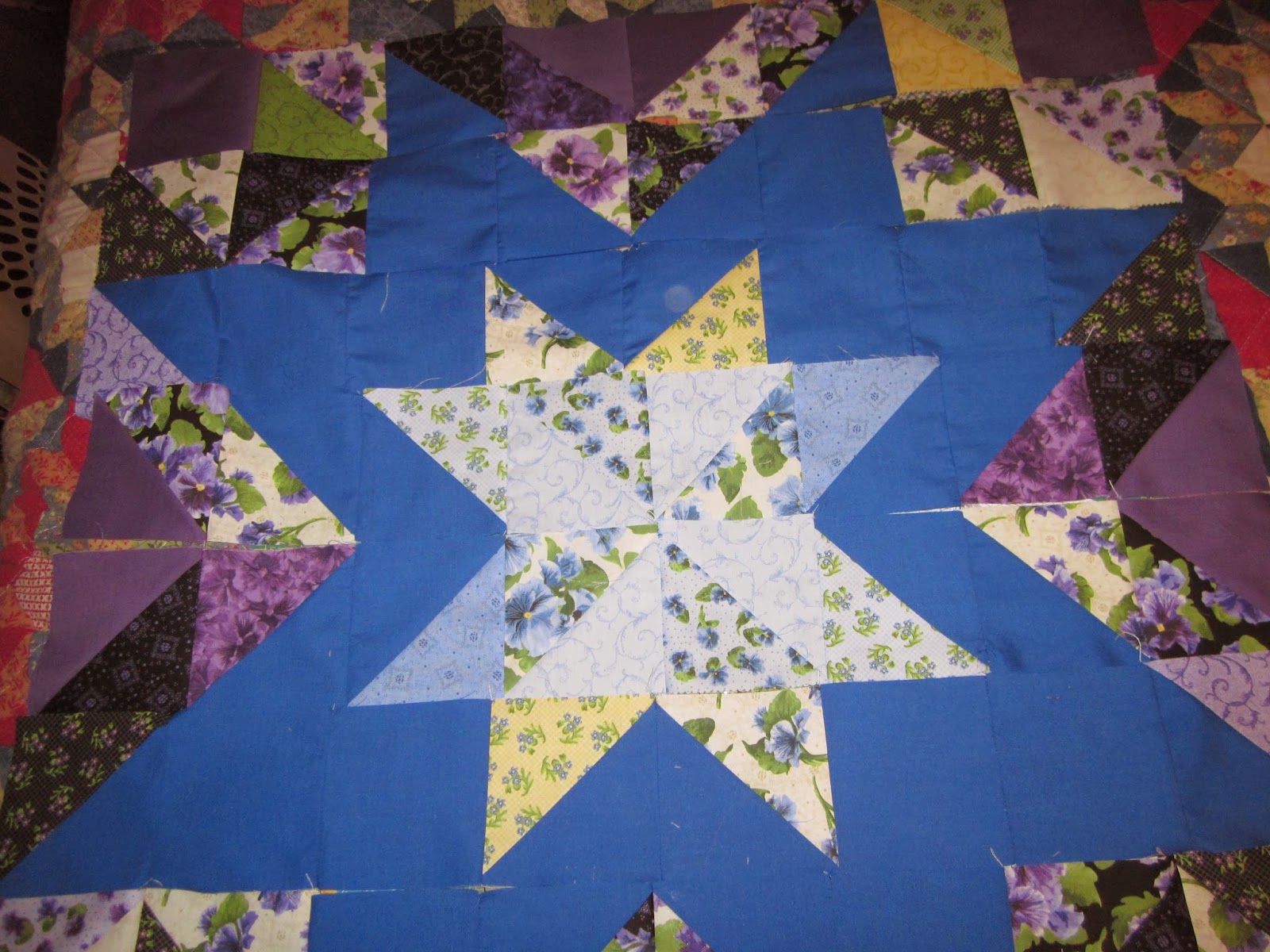 The purple star is completed but I can't get a pic of the whole thing yet. I was using my bed as a design space and that was not easy. At one point I looked up from sewing and my German Shepherd was flopped in the midst of my placed squares. Not cool Isis.